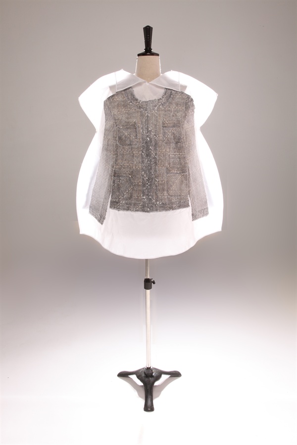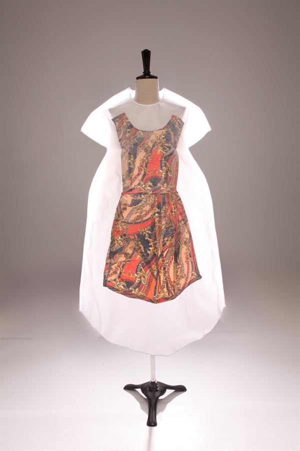 对于衣服造型与款式的设计,我准备还原防尘罩最初的设计。以其归纳出的肩部轮廓形作为基础在其上做出不失衣物防尘罩特点的立体剪裁修改,使之更美观,更有设计灵韵。材料上我选用了类似于宜家防尘罩的白色半透明经过纳米除菌效果的化学纤维15D面料,将一些经典花纹和款式的衣服进行多层复合永远的保存在15D面料中,让其永远保持其最美丽的造型和最无垢的状态。这些衣服将在防尘罩中永远的展示他们如花般绚丽绽放姿态。最后我将这些再造面料制成裁片,做成衣物防尘罩,让人们穿在身上。