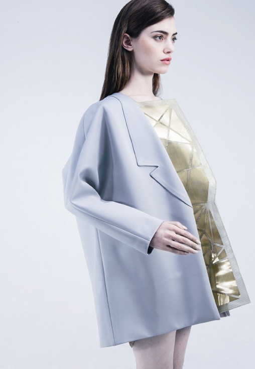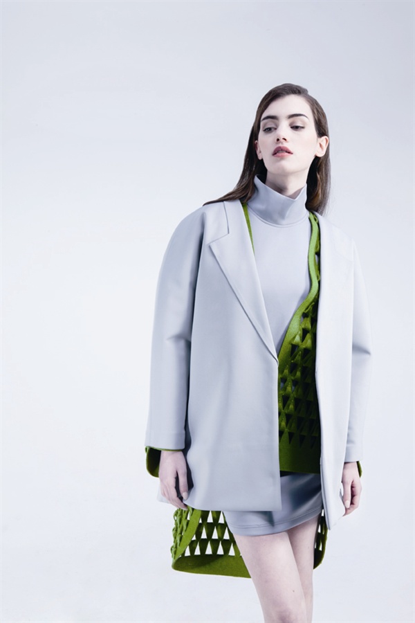 我的这组作品灵感来源于生活中自己着装过程中的一个求同从众的心理现象。人们为了迎合社交团体和社会潮流而选择“安全的”设计,而不是把自己真实的感觉通过着装表现出来。我的这组设计是表现这种矛盾的心理,通过不同的材质和跳跃的色彩来表现不同性格。使人们在迎合周围环境和潮流的时候能够真实的表现自我。我的外廓形选择保守的简洁设计,力求干净简单的廓形。独立的不同材质的里子是设计的重点。如,绿色的毛毡材料来表现稳重保守的性格,金色的铜片材料来表现理性,橙色的亚克力材料来表现叛逆与冒险。紫色的绢花来表现现实与欲望等。我试图通过表里的反差来诉说人们真实的表情。总的来说这组照片是一组轻松的