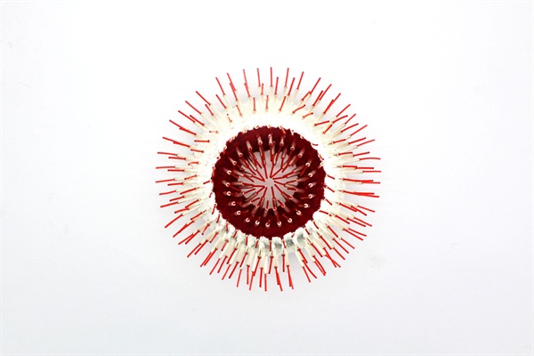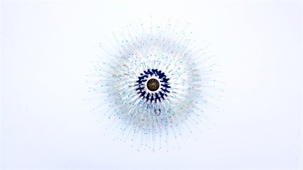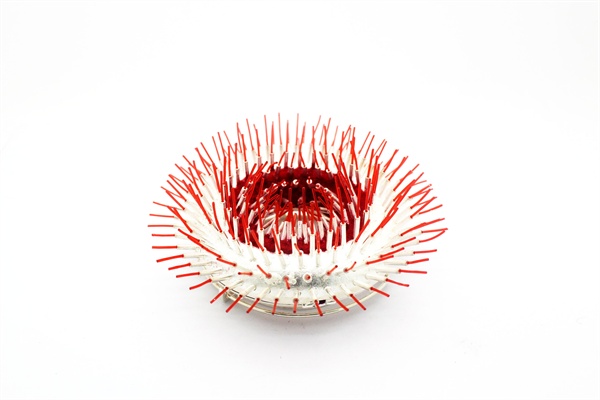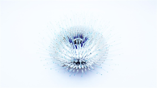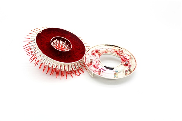 我的毕业作品为“带刺的首饰”。根据3D打印技术的特点,结合个人对刺的传达,准确地将该技术同我的毕业作品进行了统一。运用该技术节省了制作作品的工序,同时对于规律和单元重复造型的作品更加精确和理性。而我的作品本身抛开3D打印技术想要创作的是带刺的首饰,造型像刺猬一样,布满了坚硬看上去却柔软的刺,这种运用3D打印技术制作的刺规律地排列,给人以密集、戒备心很强的感觉,就好像生活中的人,总是用刺来伪装着自己,不懂得放空,将自己放松下来,总是将自己的刺朝外立着来防备外界的一切事物,这种行为不论是丑陋或者无辜都是内心最真实的写照。生活中的人就好像刺猬一样,总是背着一身的刺,其实却是最孤独的,内心最脆弱的,始终处于一种柔弱的状态。为了表达人心柔软,封闭自我而孤独的感觉,带着刺的背后其实有着毫无杀伤力,柔弱的一面,在3D打印技术制作的作品的那种刚硬,机械,冰冷,没有情感之上,我又运用丝绒和玻璃丝这些感觉柔软的材料来丰富作品感性的一面,来融化这种坚硬感。