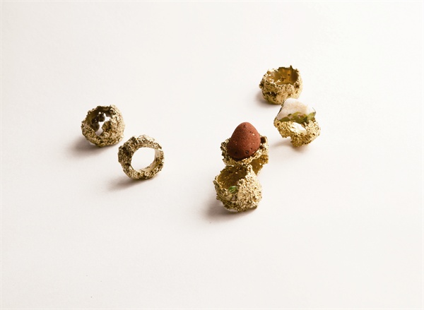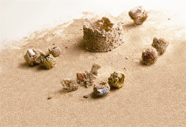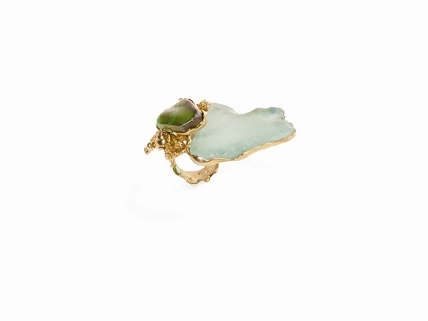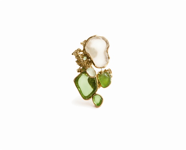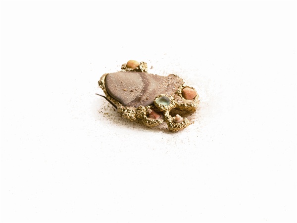 首饰作为一个载体,浓缩的不只是有关于个人的记忆,它还有着一段时光的经历和叙述。我从小在海滨城市长大,对海边对沙滩有着特殊的感情。曾经有棱有角的石头玻璃碎片在大浪淘沙风雨洗礼中被冲刷磨洗,渐渐变得光润不尖锐、含蓄优雅质地坚硬。阳光将沙石镀上了一层金黄色,运用沙子本身的特性经过首饰化的处理,保留这份宁静与自然。时光如流,岁月如沙。沙石,作为生命体与人的成长过程环境极为相似,与人的身体及精神之间存在着某种深刻的联系。