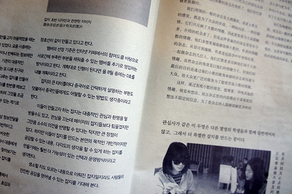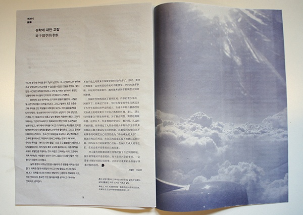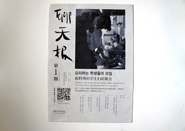 在中國的韓國留學生一般都不夠親密於中國學生,因此我考慮如何韓,中兩國學生變成更親密的關係,想到能傳達韓國留學生的信息的方法,做成校內報紙。《聊天報》是介紹中央美術學院的韓國留學生的日常生活對中國學生為了提高兩國學生之間的親密度。《聊天報》是叢現在兩國學生之間最容易做到的行為開始的。希望兩國學生交流除了學校生活以外的簡單日常信息,以使他們更能明確地互相瞭解,通過這樣瞭解,最後能產生共鳴,變成親密的朋友。