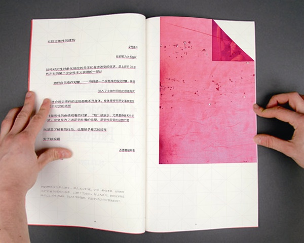我的书籍的文本主线是《自己的房间》这部小说。它是阴性书写最具代表的作品,是女性书写自我的方式,是给人看的思想。所讲述的是妇女与小说的关系,但是重点就在于整个文本里并没有直接提及妇女与小说到底有怎样的关系,而是用一些虚构的场景来讽刺男权当下的环境对妇女的一些影响。小说中“我”也有一个非常女性化的名字——“玛丽”,但是没有赋予她姓氏,小说中所有出现的女性角色的名字也都是不同姓氏的“玛丽”,不确定的姓氏代表了不同的女性个体,摇摆在多重叙述者之间,“我”不断的在解构自我、重构自我、表达自我。这正是我所谓的女性景观。内容分为故事和独白两个部分。小说中的场景、发生的故事、“我”与别人的对话都有所暗喻和象征,内心的想法更是用暗示、含蓄、间接的独白来展现。我将小说中的9个场景相对应的故事、独白分离出来,并用当下的场景的寓意来进行穿插,两个部分彼此孤立但又相互影响。书籍中与小说隐喻文本相对的是对于女性景观的资料分析和女性艺术家作品。资料抽取其中关键词作为小说文本的直接化的解释。女性艺术家作品更是直白化的信息,将她们的作品穿插在书籍的文本中,破坏了对文本的阅读,但同时也表达了在现实中确实有不同的“我”所存在,用自己的方式来表达自我,形成了不同个体的女性景观。