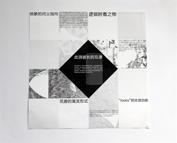 用外延、介入、转换三个英文单词来定义图像与文字的关系,使其生成五个部分,即图像的外延、文字的外延、图像介入文字、文字介入图像和图像与文字的转换,对应的五部分命名为 “looks”的含混功能、抽象的词义指向、荒唐的寓言形式、逻辑附着之物、此消彼长的互渗,随后以这五部分展开对两者的探究。