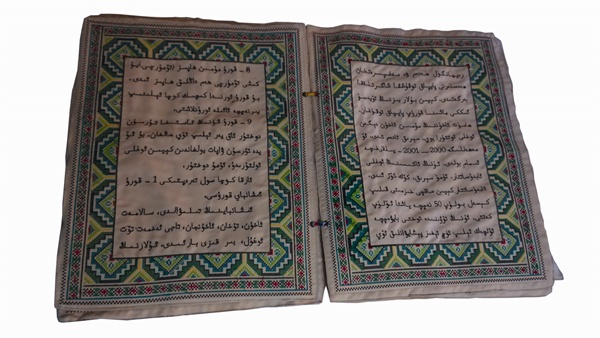我的毕业作品题目是《家谱》,我为什么要制作一个《家谱》呢?除了我们维吾尔族的君王、诗人、音乐家、思想家、哲学家等一些名人以外,家家户户最多能记得住自己爷爷的爷爷,有些混血到最后都不知道自己身体里流着多少民族的血液。连自己的祖先都忘却,我们的后人只能一步步走向衰弱。我想通过我自己的《家谱》来告诫我的同胞,记住自己的先祖,记住他们在历史上的点点滴滴,记住他们当时活的有多伟大,他们的成功与失败,警告和激励着我们。不要忘记自己是怎么来的,不要忘记自己民族的传统美!这就是我为什么要制作一本自己的《家谱》的原因。我分别设计出两本不同形式和含义的《家谱》,一本是用现代普通纸的印刷工艺,制作的《家谱》,这种方式简便,便于阅读,封面再用维吾尔族传统的花纹做装饰。另一本是用维吾尔族传统的手工艺纺织技术,纯手工一针一线缝起来,每一行字都孕育着维吾尔族人民智慧的结晶和传统美的艺术!这种方式便于存放,不像纸张一样容易撕破,挂在墙上还可以起到修饰墙面的作用,这样阅读起来也很方便,类似于壁画艺术!