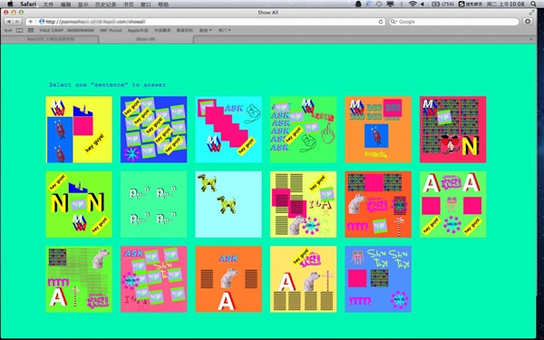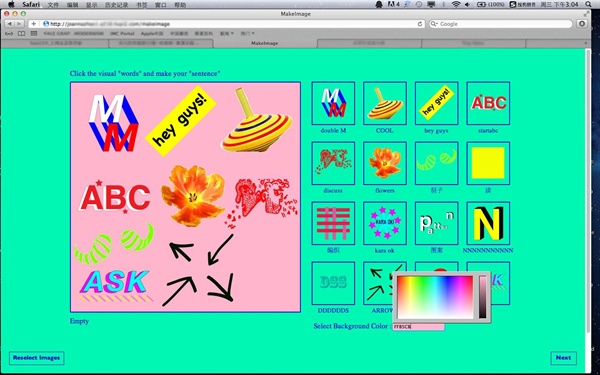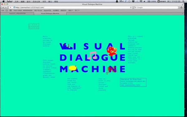 视觉语言对话器,意图研究图像和语义的关系以及图像对语义形成过程的分析总结的过程。通过一个网站“visual dialogue machine”(视觉对话器),来提供一个平台来让大家在游戏娱乐的过程中,通过网站提供的元素,并结合自己制作的视觉作品进行对话交流。如果每一个单体元素意味着“词”,那么,大于等于二个“词”就能组成“句子”。网站通过为大众提供的不同类型的元素和自由的制作区域,每个人都可以在自己的语境之下,用视觉的方式,制作自己个人的视觉作品来进行对话。同时在实际操作的过程中,可以即时的对每一个元素进行定义,新的视觉语义是建立在被大多数人认可的情况下,通过游戏的方式来简单模拟人类语言语义的形成过程。从早期的“视觉联觉¬¬”引发对每一个视觉元素意义的主观定义,进而进行“对象知觉—语义图像—思维理解”的视觉转换,通过简单模拟人类语言语义形成过程的心理结构。同时通过网站的表达方式,网络的传播效应,可以最大可能性的全球方位内的统计数据,同一个视觉元素得到了大多数人的认可与接受的所定义的意思,模仿人类语言语义形成的过程,视觉语言语义也由此确立。