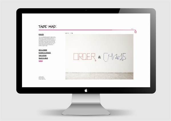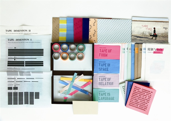 • 胶带,一个工业化的产物,任何一个家庭,任何一个单位每天都在不断地重复着“粘、剪、撕、揭”的动作,我关注并且发现这件事物在我们今天的使用中也承载着与平面设计类似的事情,在通常人们只看到胶带的功能时,我希望借用这样一个批量化的生活产物,让它在新的语境中创造出个性,重新构架秩序,探讨平面设计的可能性。作品以胶带作为形式来讨论关于“秩序与混乱”这一主题。分成两部分,第一部分由前期的研究与设计试验而形成的四个小项目,分别是:粘——“限制与自由”、剪——“有效与失效”、撕——“既定与随机”、揭——“收集与生成”,分别讨论平面设计的形式、信息、媒介与文字。第二部分是作品的提炼与编辑,即用有限的一卷最小尺度的10米胶带来探讨说明“秩序与混乱”的概念。希望这些部分探索能唤起人们对身边的“普通物品”的二次思考,关注它们可为艺术与设计的发展提供新的方法与意义的价值。