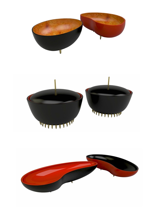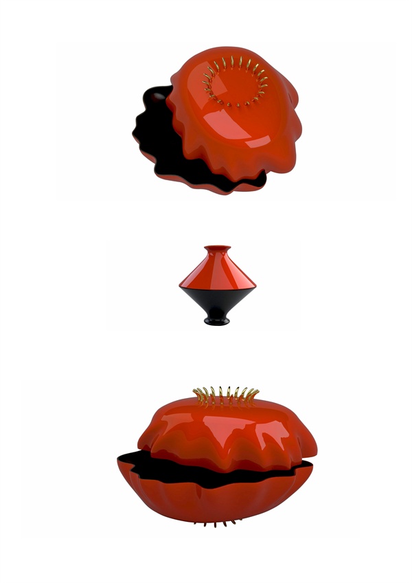 作品8号:南瓜盅 16.16.10cm 设计说明:是单纯的产品设计。他们大都是市场里已经出现过的产品。我将其进行了精加工和重新的简单设计,添加了一些不同的设计点,总体上仍旧是可以想象得到的使用方式和效果,只不过在工艺技术上进行了不同于普通大众市场的制作方式,传统大漆工艺的附加,绝对是将简单的产品,不普通化了。