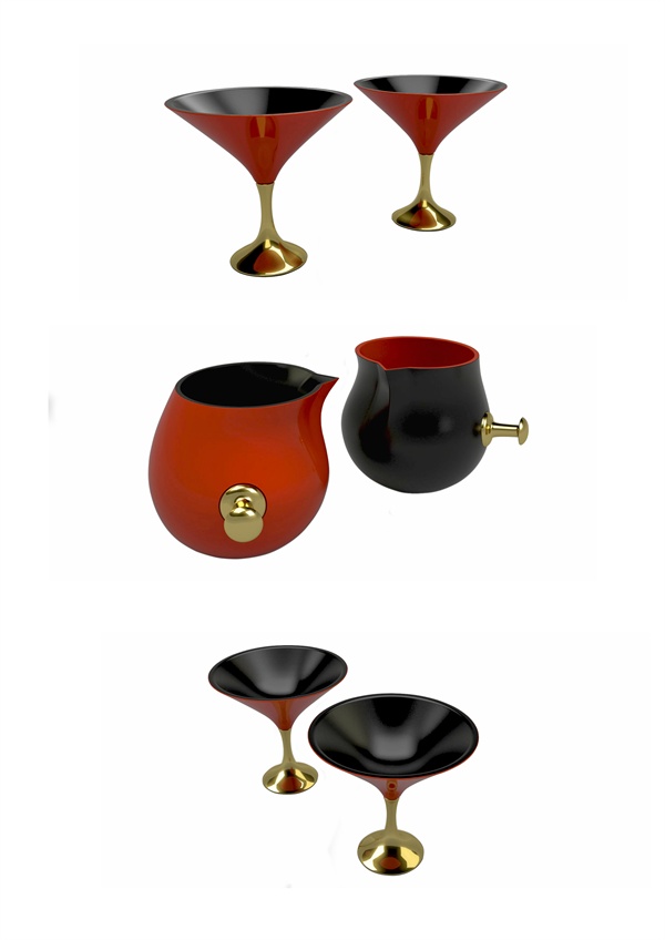 作品1号:金底酒杯系列 5.5.10cm 设计说明:金属底座配上大漆的上半部分,杯子采用漆艺固化榫接方式。杯子的内部是黑漆,平涂,杯子的外面使用红漆和透明漆的混搭。