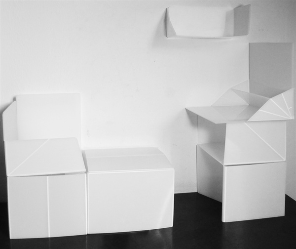 在快节奏和多元化的日常生活中,人们的行为状态变换的时间日趋减短,迅速游走于工作、学习、休息、对谈等各种基本的生活状态中,而让一个空间适应多种功能的需求越来越符合人们的生活需求,缩短变换的时间,在折叠翻转的结构形式上,迅速创造适合人们行为状态的氛围,满足人们短暂状态中的心理。