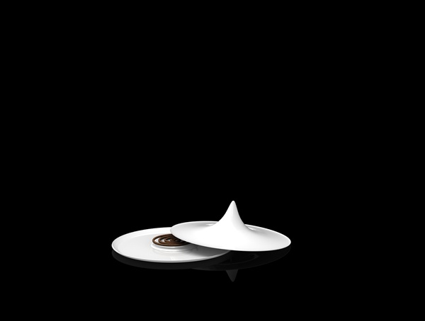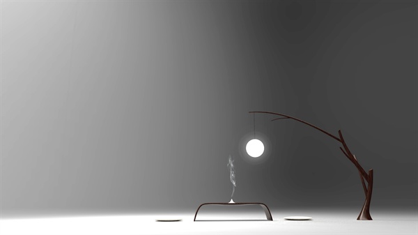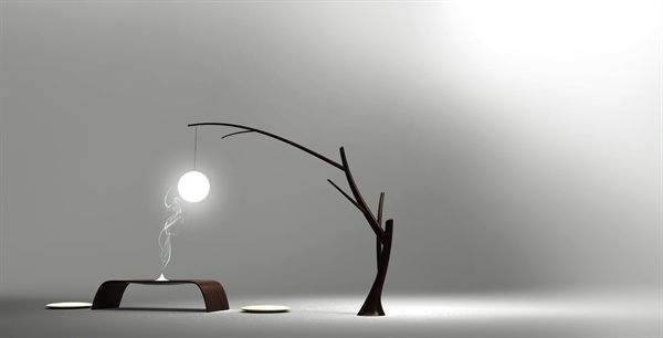 选定三种意象元素,梅枝,丝绸,斗笠,结合其特点进行家具设计,依次为落地灯具,条案,香台共三件。